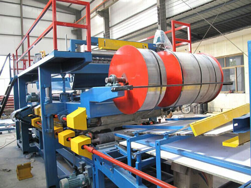 复合板机能一次性复合成瓦楞型复合板,全套流水线由装料开卷系统、成型系统、切断装置、复合系统(压筋、涂胶、加温、复合、卷边、开槽、整边、气动、自动切断)组成,整个过程由电脑控制,是生产工业厂房、仓库等房面板和墙板的设备。